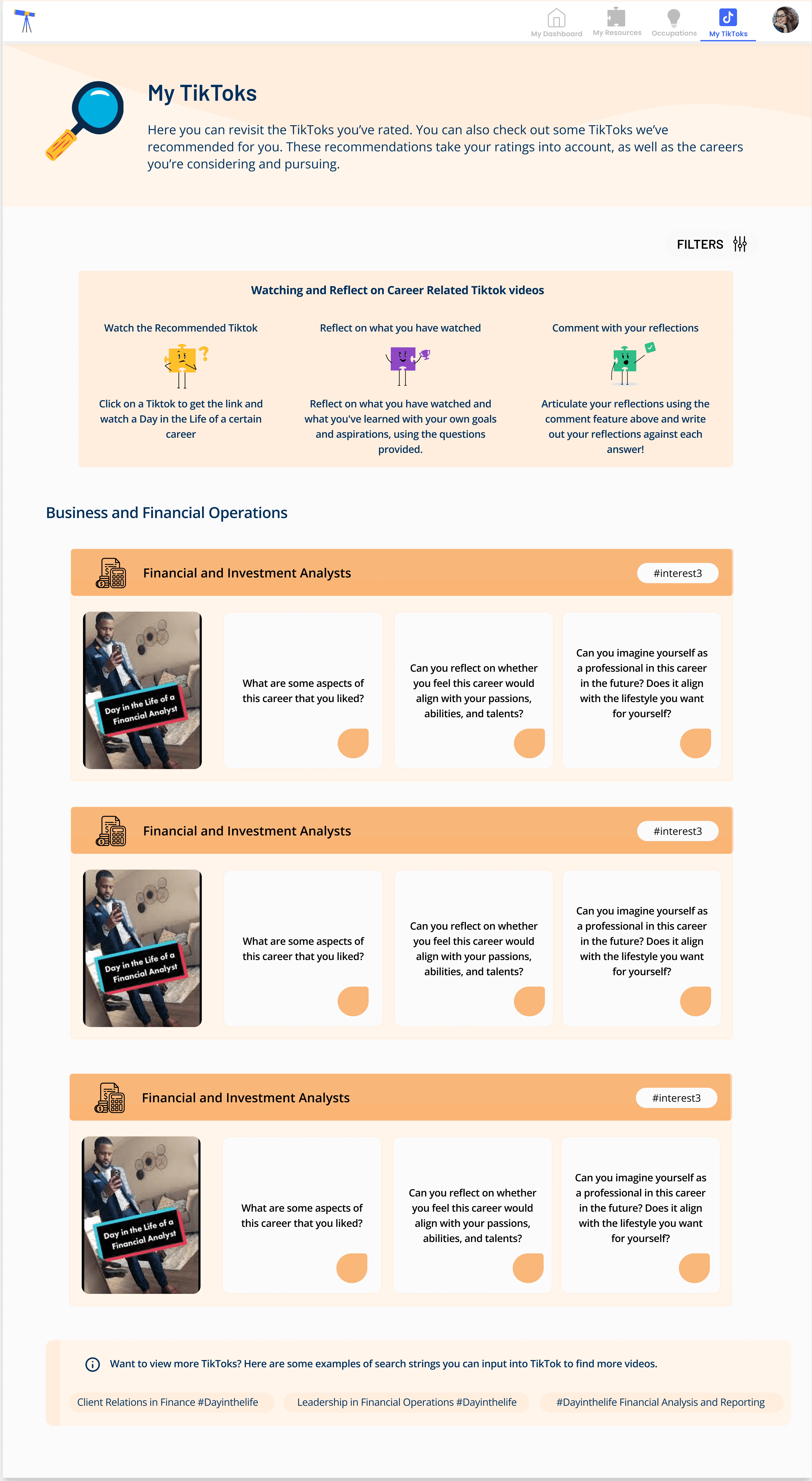 Our research on youth career exploration highlights social media as a powerful tool for both social and self-directed learning. This inspired us to incorporate "Day-in-the-Life" videos to give students an inside look at careers that aren't typically covered in school. We chose TikTok as our source, given its popularity among teens and the variety of relevant content it offers.