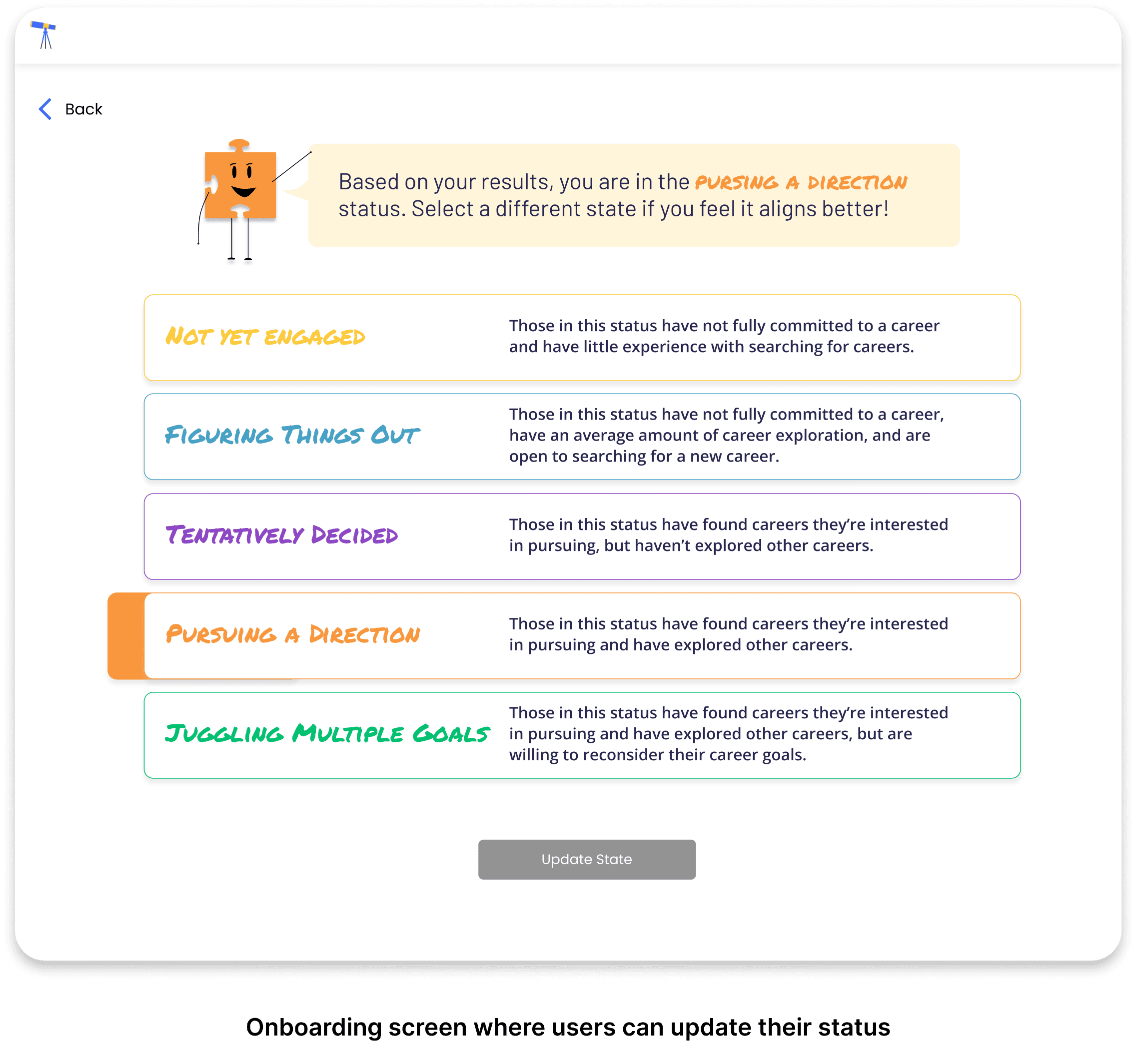 We learned that students are at different stages in their career exploration. Through our research, we came across the Meeus-Crocetti Model, a framework that categorizes students based on their level of exploration. This helps us tailor resources to better support each stage of their journey.