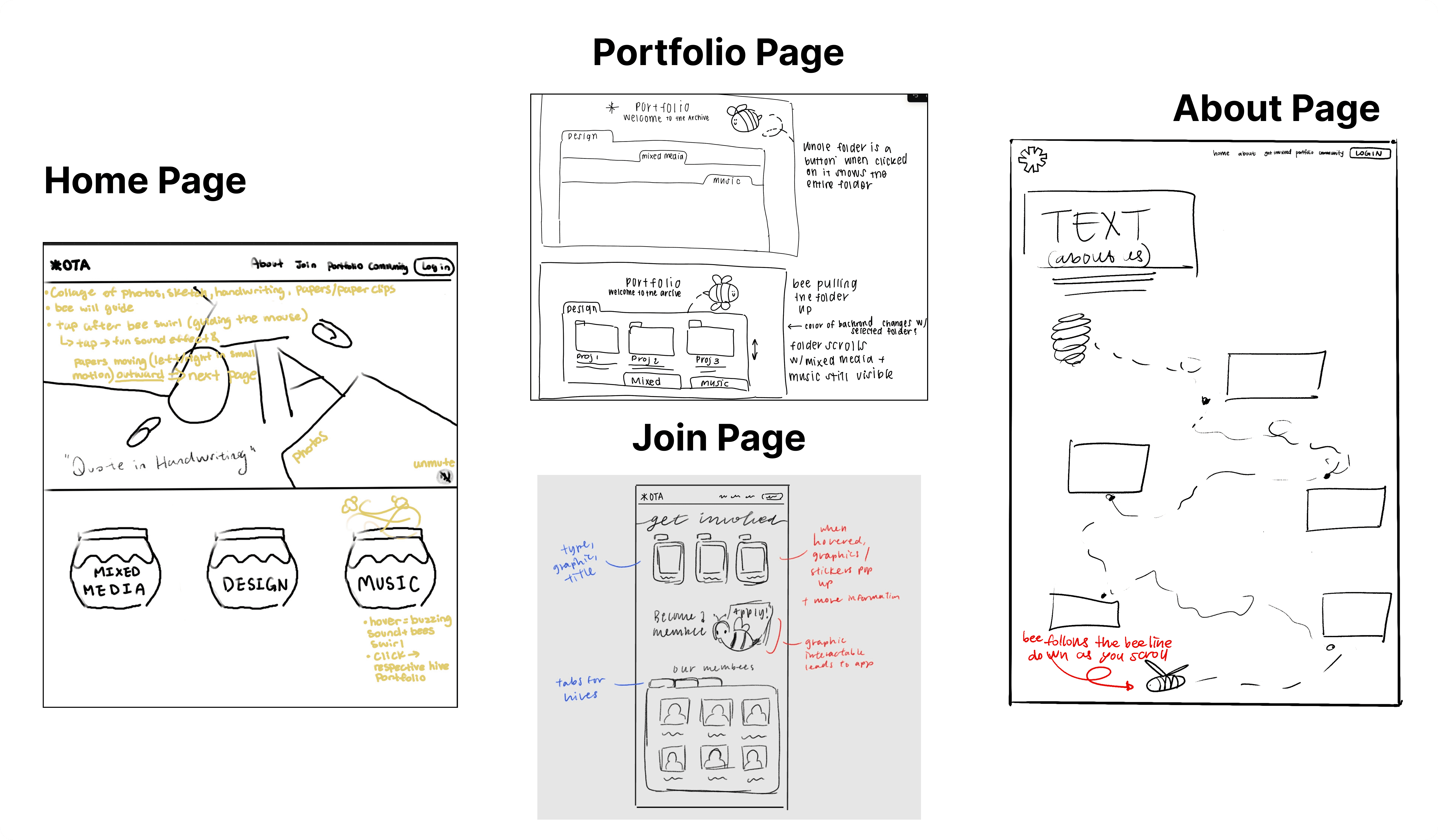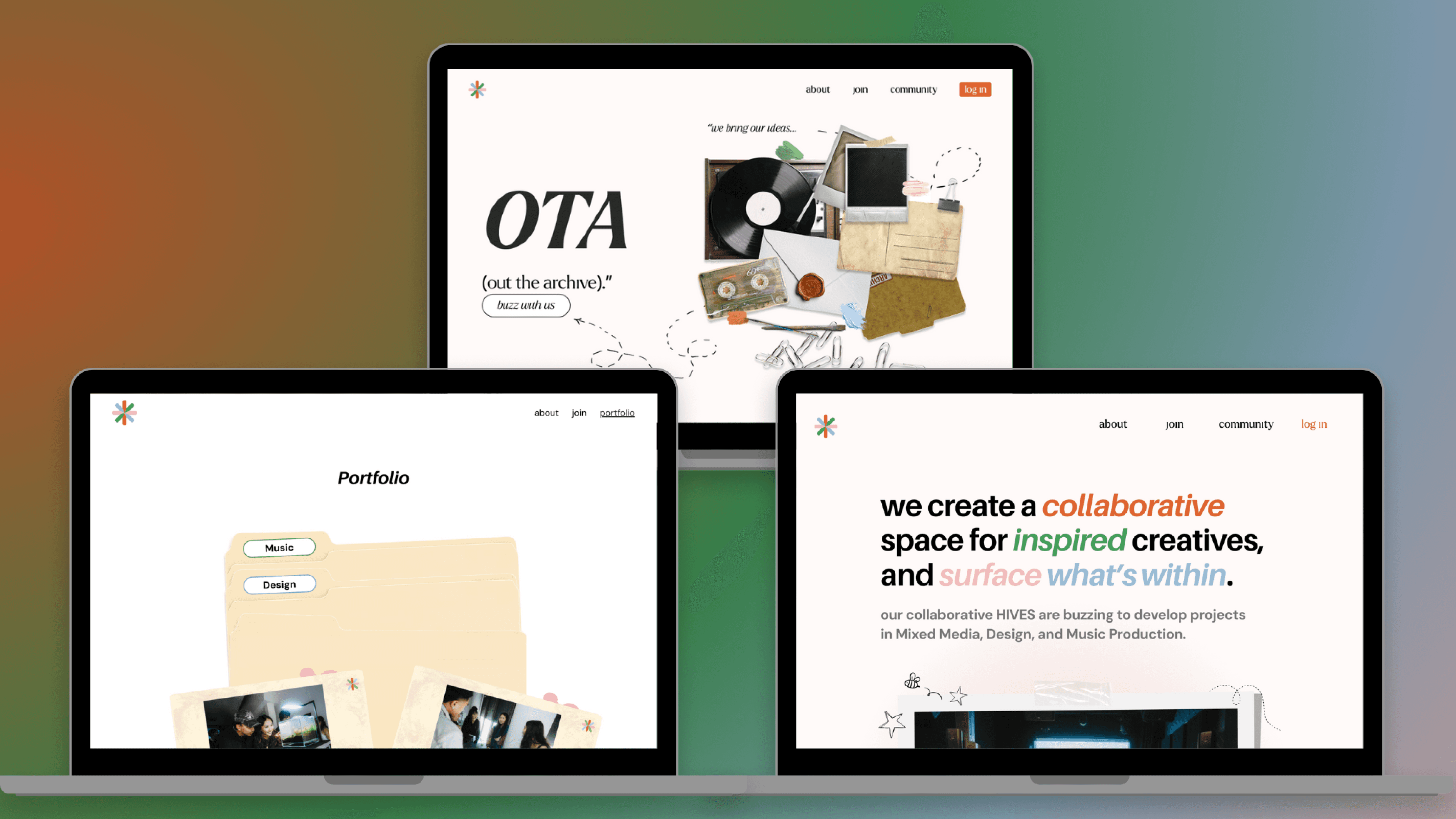 Through multiple design iterations, we built OTA’s first official site in Figma and Framer, creating an on-brand, interactive experience that felt playful yet intentional. The Home Page featured draggable creative items and event callouts to boost engagement and involvement. The Story Page used doodles and scrappy visuals to share OTA’s origins, while the Join Page highlighted events, applications, and members to inspire participation. I led the Portfolio Page, designing interactive folders and postcards to showcase member projects, supported by a streamlined content submission process. Together, these pages established a cohesive, creative hub that amplified OTA’s presence and gave students a visible platform to share their work.